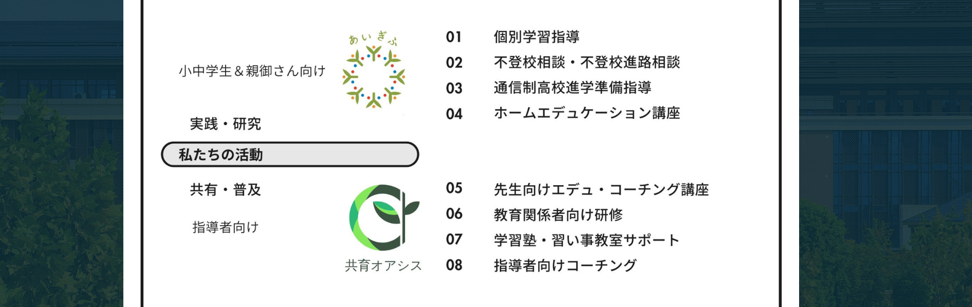 人材育成、フリースクール運営、学習塾等での個別指導や
